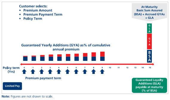 You pay premiums every year for selected premium payment term. After expiry of premium payment term, the policy continues till maturity. At maturity, you will receive Guaranteed Maturity Benefit i.e. Sum of Basic Sum Assured (BSA), Accrued Guaranteed Yearly Additions (GYA) and Guaranteed Loyalty Addition (GLA). Basic Sum Assured (BSA) will be based on the Premium, Policy Term, Premium Payment Term and Age of the Life Insured.